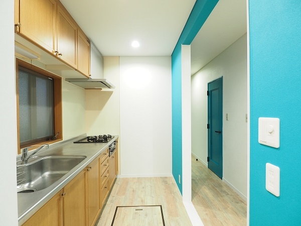 キッチンと廊下の間仕切りを撤去して空間を広くしました。